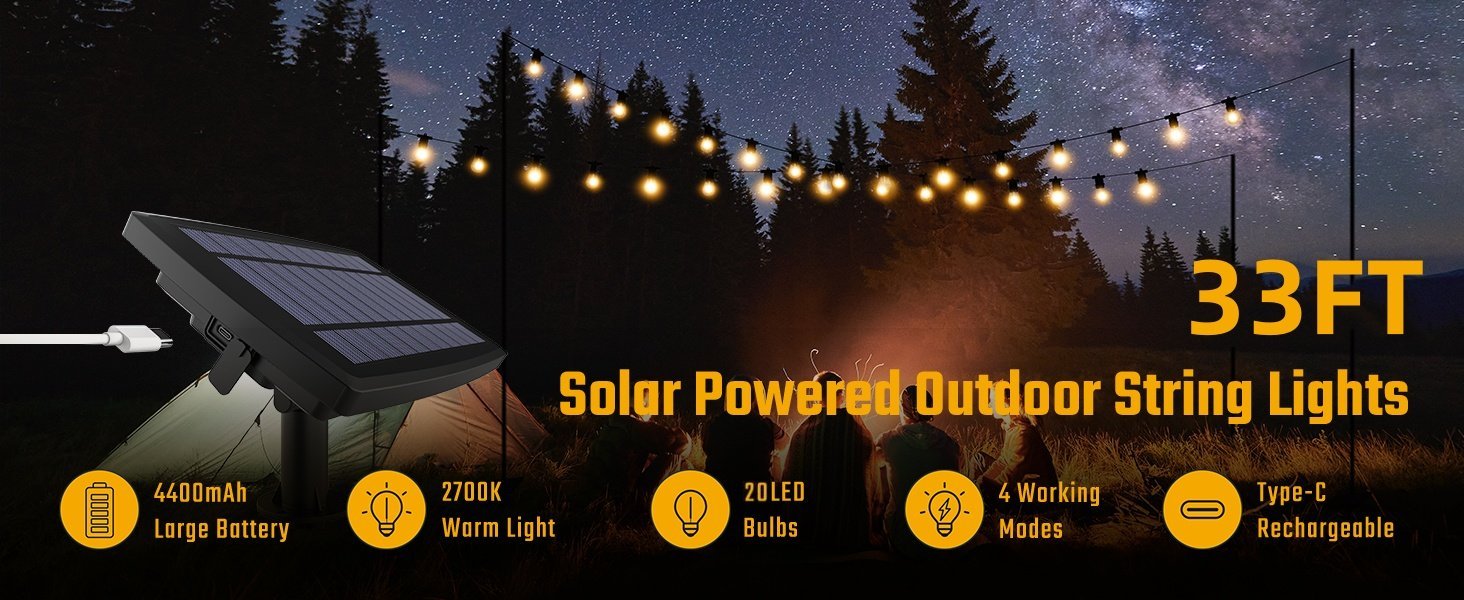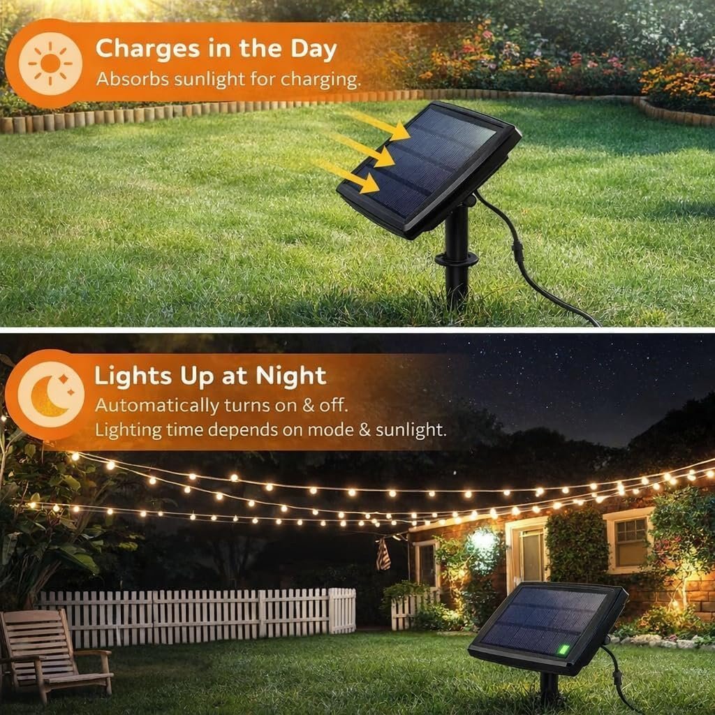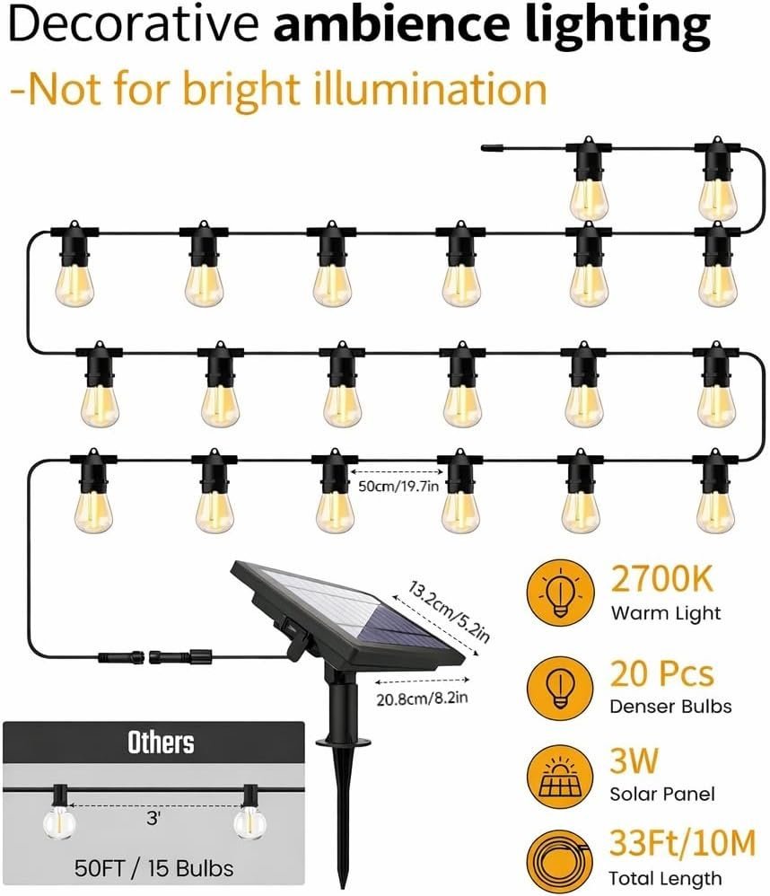 33FT / 10M Total Length with 20 Bulbs: 10 meters (33 feet) in total with 20 S14 bulbs, spaced closely for enhanced decorative effect. Ideal for outdoor gatherings, events, or simply adding charm to your space. Brightness and lighting duration depend on sunlight exposure and charging conditions.