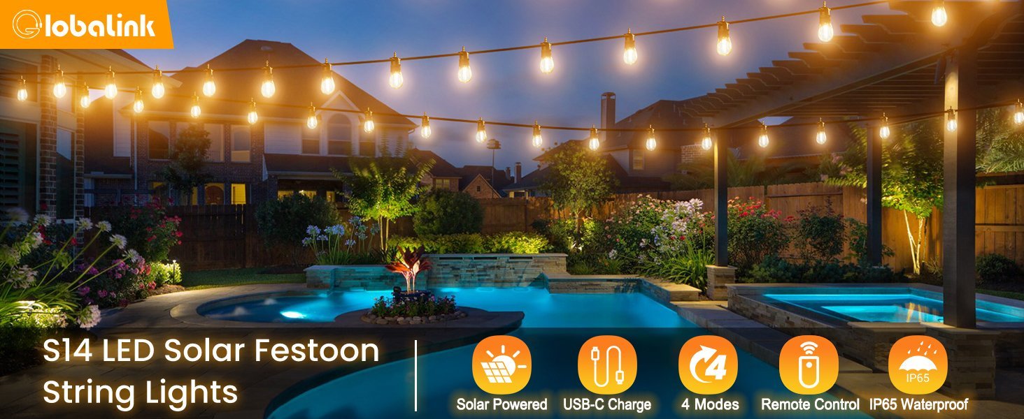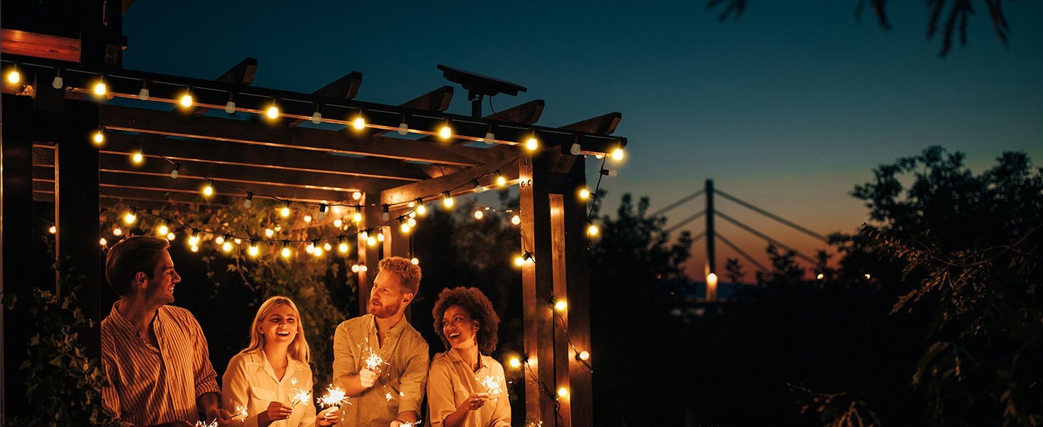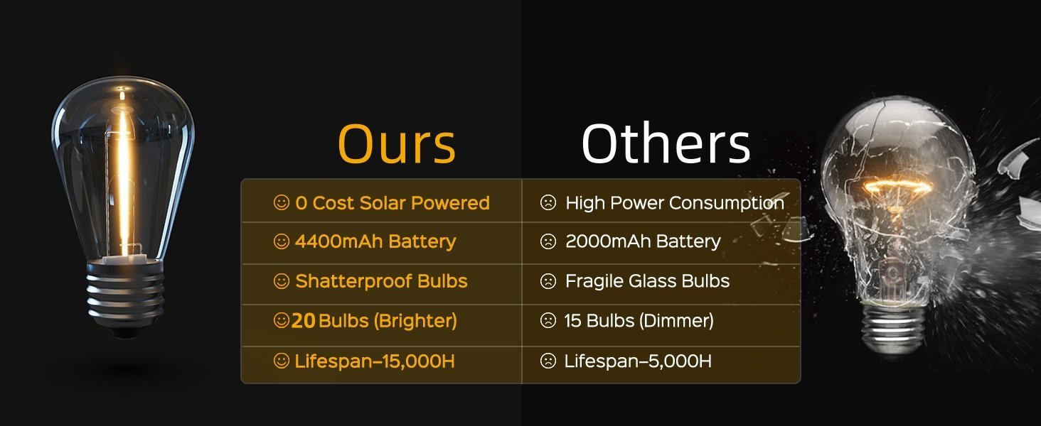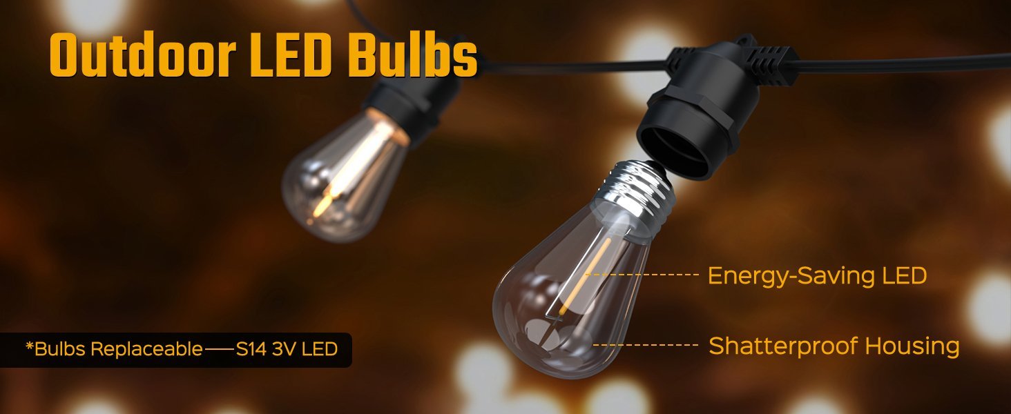 33FT / 10M Total Length with 20 Bulbs: 10 meters (33 feet) in total with 20 S14 bulbs, spaced closely for enhanced decorative effect. Ideal for outdoor gatherings, events, or simply adding charm to your space. Brightness and lighting duration depend on sunlight exposure and charging conditions.