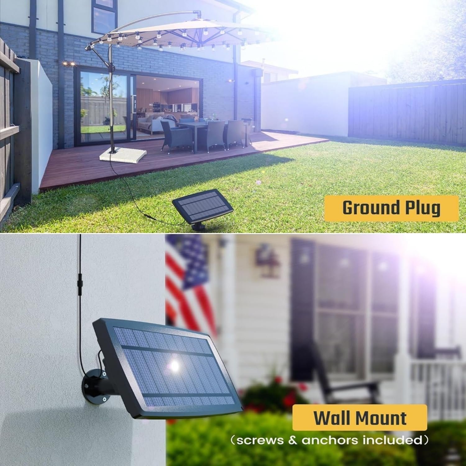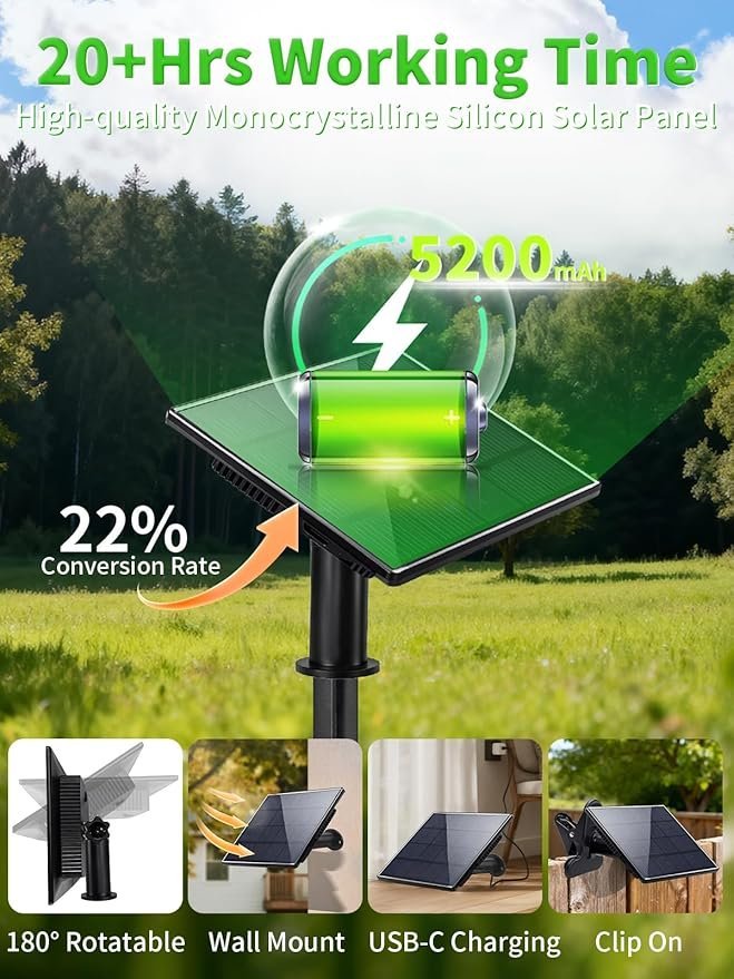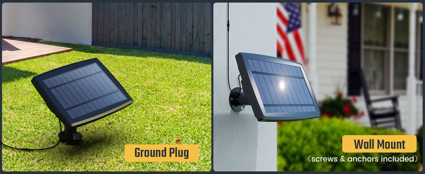 Multiple Installation Options: The solar panel can be installed using a ground stake or wall mount (screws & anchors included), allowing flexible placement for optimal sunlight exposure.
